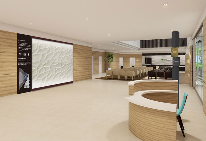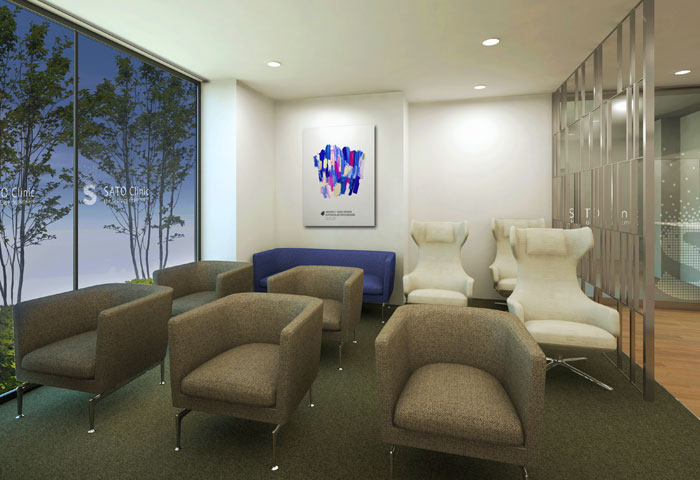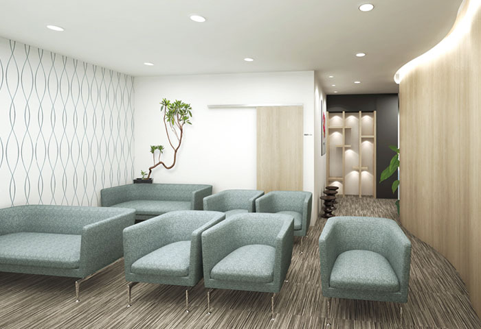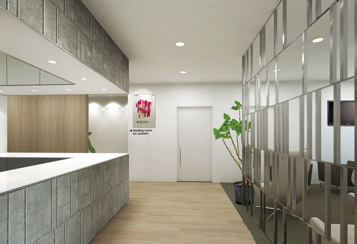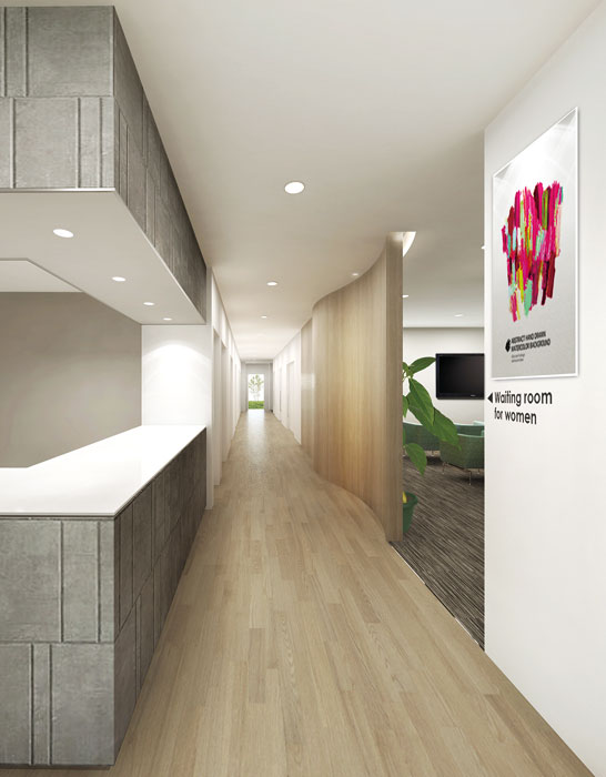 下のパース画像は、ある泌尿器科の計画図である。(写真1)はエントランスからの眺め。右側は男性用待合室をさり気なく遮るステンレス製のパーテーション、左奥にはグラフィックパネルと切り文字で誘導する女性用待合室が見える。(写真2)は女性用待合室の入口。男性用待合室の鉱質的な直線造形に対して、木目のパネルで柔らかな曲面を設けている。(写真3)は女性用待合室。曲面パネルの上部には間接照明で光の演出を行う。(写真4)は男性用待合室。予め受付での「口頭による誘導」を前提にしているので、グラフィックパネルの色差(男性は青、女性は赤)が記名サインの役目を果たす。