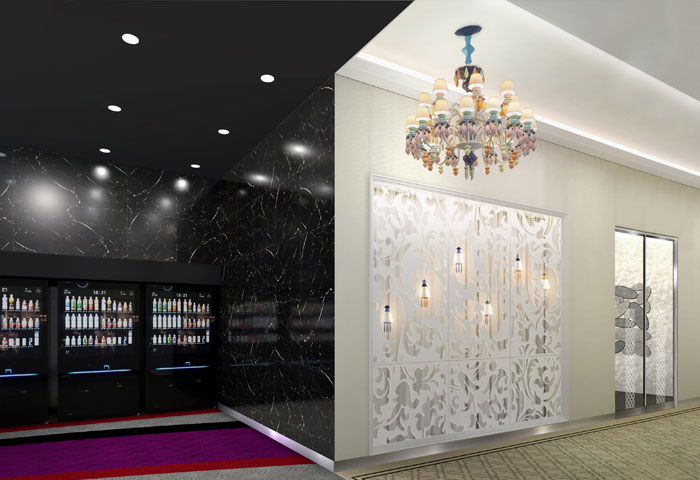 (写真6)は遊戯場の女性ラウンジ入口通路の計画図である。左に見える黒いスペースは自動販売機と男子トイレにつながるコーナーになっていて誰でも利用できるが、右側の白い壁からは女性客しか入れない。磁器人形で有名なスペインのブランドが製作した磁器性マルチカラーのシャンデリアと壁面の装飾パネルの中に吊るした6色のペンダントで、砂糖菓子のような甘やか女子オーラ全開の空間を目指した。