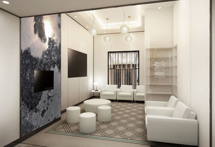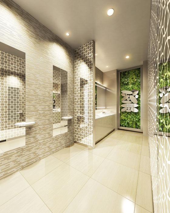 そして(写真7)の女性専用ラウンジへと続く。主婦なら自宅用には絶対選ばないオフホワイトビロードのソファ、カットワークの妙で透明な光を放射する樹脂製のペンダント、アクセントに添えた墨絵をイメージした金属パネルで非日常空間を演出した。(写真8)は女性用パウダールームである。空間の狭さを補うために壁面に鏡を多用した設計だったので、柔らかく包むようなニット柄のモチーフを鏡に貼って、お化粧直しの時の映り込みの不快感を軽減させた。奥の壁面のフレーミングしたウォールグリーンには、メッセージボードのようなサイン的要素を持たせている。