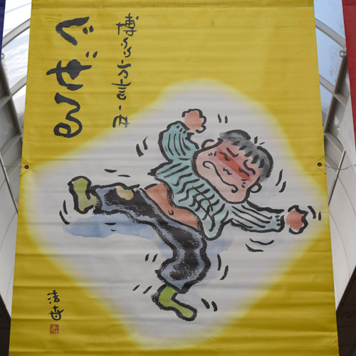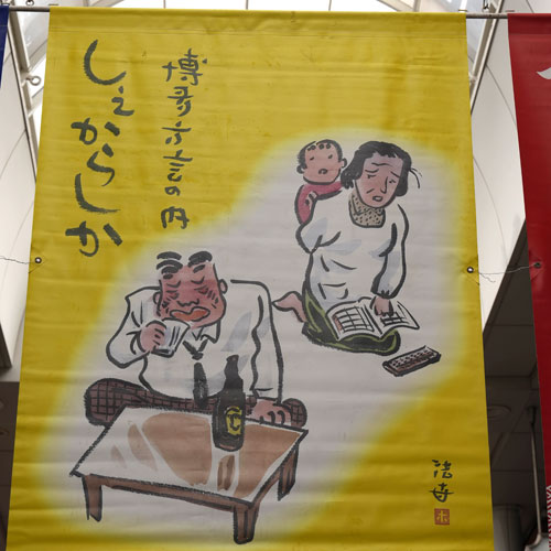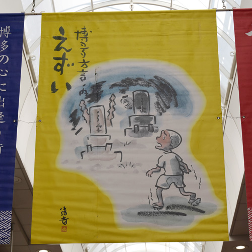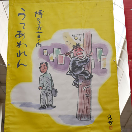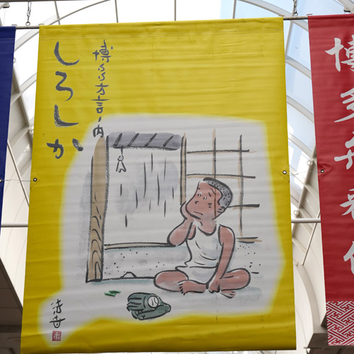 博多の総鎮守、櫛田神社から徒歩一分の所に川端商店街があります。博多で最初に栄えた商業の街で全長400mに飲食店、衣料品、その他専門店がありそのアーケード天井から吊るされたバナーの紹介です。今はあまり使われていない博多弁が漫画と一緒に描かれており端から数えていくと、12本ありました。