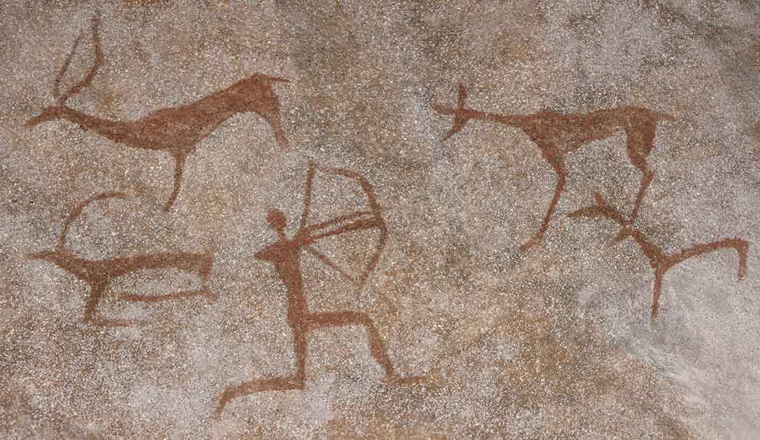 ネアンデルタール人が洞窟内で描いたとされる紅土壁画。言葉のない時代に、生きるために狩猟風景を伝えようとした図ではあるが、ピクトグラムの原型ではないだろうか。