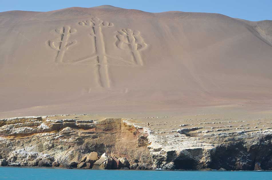 ペルー沿岸パラカス湾の崖に彫られた、約250mの高さの「枝つき燭台」と言われる巨大な図形。ナスカの地上絵も同じく、誰が、何のためにつくったのかは分からないが、何かを伝えようとするサイン的なエネルギーに満ち溢れている。