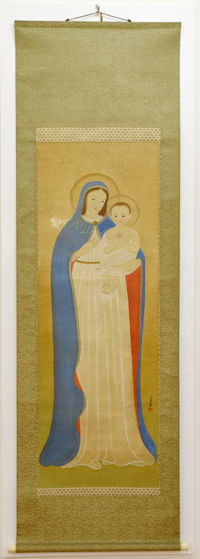 私はカトリック信者で、幼い頃から数多くの聖画を見て育ちました。その大半は油絵やフレスコ画で、描かれているのは西洋人のマリア様でしたが、ところがその絵は日本画の聖母子像でした。所有者の方は、クリスマスになると通りから見えるお座敷にこの掛け軸をかけ、道行く人々にも見せておられました。