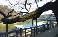 千鳥ヶ淵を皇居の堀沿いに歩いていたらこんな風景に出会いました。 巨大な桜の枝にトラテープが包帯みたいにグルグル巻き。どうしたことかと一瞬考えましたが、この枝に頭をぶつける人もいるのでしょう、注意サインのようです。でも、無粋なことこの上なし。場所柄からしてもっとやり方がありそうなものですが。