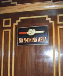 以前、福田繁雄の反戦ポスターで機関銃の銃身がこんな風に結ばれているのがあった。確固とした意思を視覚的に表したものとして優れたデザインと思った。 インドに旅したときアーメダバードのレストランでこんな禁煙サインに出会って「ややや」と思った。これは福田繁雄の本歌どりなのか、それともデザイナー氏の独自発想か。 レリーフで表した巨大サイズにもビックリ。ほとんどアート作品の領域ではなかろうか。これではこそこそタバコは吸えません。