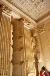 最近は都市でお墓用の土地が不足しているため団地式が大流行です。四周の壁に貸しロッカーのように扉がぎっしりと並んでいて壮観ですが、ちょっと味気ない気もします。ところが、なんとこの方式は古代にもあったのですね。シリアに行ったとき古代都市パルミラで案内されました。死者をそのまま箱に収め、柱と柱の間に引き出し式に何段にも重ねて入れます。写真に見えるベロが引き出し受けです。でも、この墓所は身分の高い一族のもので先祖代々の死者が入ります。墓の内部は素晴らしい石彫で飾られ豪華そのもの。そんなお墓がこの一帯には幾つもあります。
