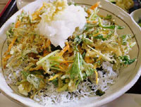 ここの「ちりめん丼」は名前の通り、ちりめんと野菜の入った大きなかき揚げが一番上にドーンと鎮座しております。しかもその下には基本どおりたっぷりの釜揚げちりめんがしきつめられています。