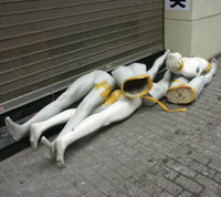 いま、万博に燃えている上海に数年前行った。まだ明けきらぬ街中をウオッチングしていたらこんな風景に出合った。「すわ、バラバラ事件か!」とハッとしたが、ただのマネキン人形だった。おかげで眠気の残る頭がすっきりした。あとで片付けるつもりで店頭に出しておいたのだろうが、こんな状態で置かれていては薄もやの下何とも生々しいではないか。 国際都市を目指す上海としてはこんなことにも注意を喚起してほしいものだ。