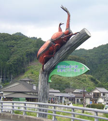 ![]() 大分県南部、佐伯市直川の国道沿いにある「かぶとむしの村を創る会」が中心になって立てた、ランドマーク的オブジェで、カブトムシが5、6メートルぐらいありインパクトがあります。村おこしの一環で、夏になると子供の飼っているカブトムシを使っていろいろな大会を開きます。大分県では、椎茸の栽培が盛んで、栽培に必要なクヌギ、コナラなどの原木をたくさん植林していて、クヌギやコナラの木が大好きな昆虫も、自然とたくさん生息しているのだと思うと、思わぬ副産物が、村おこしに一役買っているようで。 |