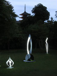 ![]() ───関西支部 広報委員 井野克彦 6月17日、安彦哲男さんのネオンアート展を見学。場所はさくらの名所で有名な京都は高台寺の月眞院の庭。到着した20時頃には辺りはすでに暗く、月眞院前の「ねねの道」の不気味なこと。今にも一つ目の虚無僧が向こうから歩いてくるようで、百鬼夜行の行進してそうな雰囲気は中々よかったです。 安彦さんと言葉を交わし握手したのですが、力強く握り返され、作品に対する意気込みを感じました。白と黒の鉄のオブジェに、白のネオンの光が幻想的でした。今回は、書家の川尾朋子さんと二人展。「白と黒」という接点を持つ異なったエネルギーの共存の可能性の追求がテーマでした。 |