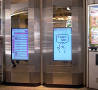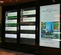 ・スクリーンセーバー電子ポスター機能 ・多言語機能(日英) ・簡易更新機能(EXCELベースでの店舗情報更新) ・比較的低価格で、店舗がテナントの情報をUSBで変更できる機能(仕組み) ・フロア案内、50音検索などの機能 ・その他、高輝度液晶パネルを採用 ■東京ミッドタウン 2007年3月にグランドオープンした東京ミッドタウンでは、デジタルサイネージを使ったハイクォリティなタッチパネルと多彩な情報で来訪者へのていねいな対応がなされている。施設内には、約200枚のディスプレイが設置されており、目的に応じて単方向または双方向のコンテンツを配信している。