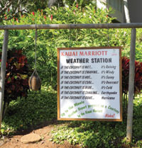 ココナッツが濡れていたら……………今は雨 ココナッツが揺れていたら……………今は風の日 ココナッツが熱かったら………………今日は晴れ ココナッツが冷たかったら……………今日は曇り ココナッツが青くなっていたら…………震えるほど寒いはず ココナッツが揺れていたら……………今、地震です ココナッツがなくなってしまったら………今日はすごい嵐 マリオットホテルのただいまの瞬間天気予報 アロハ!! 世の中にはすごい気象庁もあるもんだ。 これなら絶対外れない!