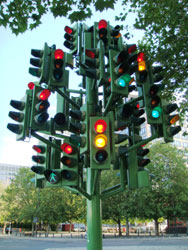 ロンドンの広い通りの交差点には信号灯がいくつも付いています。横断歩道の途中に緩衝地帯が左右にあり、そこにも付いているから合計すると相当の数になります。 そんな光景を茶化したようなオブジェにはびっくり。赤、黄、青のランプが勝手にチャカチャカ点滅していて巨大なクリスマスツリーのようでもありますが、どっちかといえば信号灯のお化けという方がふさわしいでしょう。 英国人らしいユーモアセンスのたまものです。