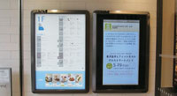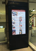 まずは商業施設系から。写真1は「銀座コア」のエントランスに設置されたデジタルサイネージです。60インチくらいのディスプレイを使って、テナント紹介などを行っています。目新しいものではありませんが、階数と店名だけを記す従来の案内表示とは違って写真付きでテナントが紹介されるので、特に飲食店等はどのようなお店なのかイメージしやすくて効果的だと思います。