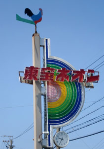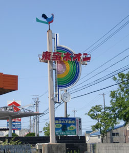 弊社のモニュメント(野立看板)は七色の虹色ネオンに社名と風見鶏つきで常に景気の動向をうかがっている。