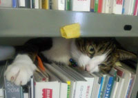 最近は資料と資料の間にあるBOXの上がお気に入り。ひたすら気配をかんじさせず佇んでいます。