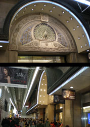 ![]() 心斎橋辺りをうろつきながらふと見ると、D百貨店本館の地下鉄入口付近にあるネオンのボーダーが軒下に沿って設置してあるのに気づきました。見上げながら行くと、本館入り口に孔雀の豪華な彫刻欄間をボーダーが囲むように設置されていました。 ホームページには、建て替え工事での心斎橋商店街側の孔雀の欄間やネオンボーダー等は掲載していませんでした。また南館の屋上ネオン広告塔の記事も掲載されていないので、残す方向でいるのかな???是非残して欲しいと思います。 |