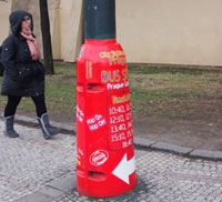 プラハの電柱は根本が極端に太くなっています。そんな電柱をわざわざ造ったのかと思ったら、電柱に鋳物製のくり型を左右から抱かせてボルトでしめつけてありました。車がぶつかっても壊れないように保護しているのでしょうか。そこにカラフルな広告文字が書かれているものを時々見かけます。行政当局が媒体として貸しているのかと思って現地ガイドに訊いてみました。そんなことは絶対ないとのこと。ということは違法広告。それにしてはちゃんと塗装され、レタリングも洒落ています。さすがは古都プラハ。