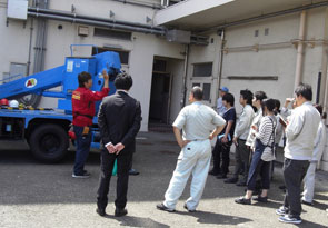 6月14日(火)東京都立職業能力開発センター大田校にて高所作業車取扱安全講習会が開催されました。 この講習会は、関東ネ協及び潟Iートレント様より全面協力のもと同校の清都泰弘指導員、加藤洋一講師、中山秀介講師の立会いにより2部編制の計23名で行われました。 見学前には高所作業車の始業点検(損傷・ガタ・油漏れ等)、また安全帯やヘルメット着用、据付状態の確認説明、車両の周りを巡り、目視点検確認説明や傾斜地での車両設置について(アウトリガの張り出し等)の重要性を説明し、(株)オートレント 田中利明氏より実際にバケットへの搭乗、縦・横・垂直・水平移動の作動を見学してもらい高所作業車の具体的な構造から操作に関する技術を学びました。 見学する間にも作業する際の周囲状況や歩行者、強風など悪天候時についての注意事項の説明を受けながら、生徒さんからも活発な質疑応答がありました。学生の皆さんから学ぶ意識の高さが感じられました。今回受講された生徒さんは屋外広告業・ディスプレイ業・イベント業等を主に学んでいるそうです。実践的なスキルアップにつながる有意義な講習会になった事と思います。
