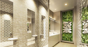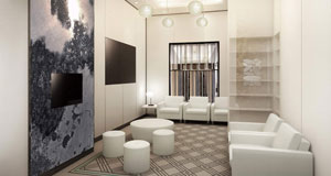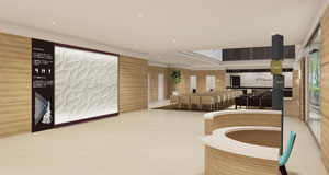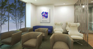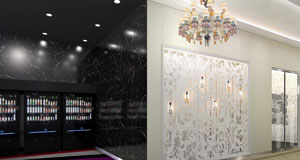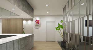 余談だが、医療施設ではサイン計画とホスピタルアート計画が並行して進められる場合がある。建築設計者を中心にプロジェクトが進む場合は問題ないのだが、同じ場所でサインとアートのバランスが取れず、落ち着かないケースに遭遇することがある。視認性の検証や設置方法の提案などサインデザイナーやサイン製作者がアート計画に協力できる場面は数多くある。アーティストやアート作品提供者と積極的に関係を持つようになれば、ホスピタルアートもサイン関連ワークとして成立するのではないかと考える(写真5:ホスピタルアート+サイン計画図)。 (写真6)は遊戯場の女性ラウンジ入口通路の計画図である。左に見える黒いスペースは自動販売機と男子トイレにつながるコーナーになっていて誰でも利用できるが、右側の白い壁からは女性客しか入れない。磁器人形で有名なスペインのブランドが製作した磁器性マルチカラーのシャンデリアと壁面の装飾パネルの中に吊るした6色のペンダントで、砂糖菓子のような甘やか女子オーラ全開の空間を目指した。そして(写真7)の女性専用ラウンジへと続く。主婦なら自宅用には絶対選ばないオフホワイトビロードのソファ、カットワークの妙で透明な光を放射する樹脂製のペンダント、アクセントに添えた墨絵をイメージした金属パネルで非日常空間を演出した。(写真8)は女性用パウダールームである。空間の狭さを補うために壁面に鏡を多用した設計だったので、柔らかく包むようなニット柄のモチーフを鏡に貼って、お化粧直しの時の映り込みの不快感を軽減させた。奥の壁面のフレーミングしたウォールグリーンには、メッセージボードのようなサイン的要素を持たせている。