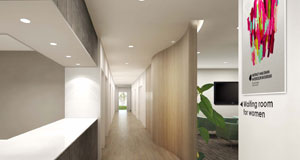 大学を卒業して業界最大手の下着メーカーに就職した。バブル経済の最終期、証券会社に入社した友人は、上司の海外出張土産として部署の女子社員全員にルイ・ヴィトンのお財布が配られたと喜んでいたような、とんでもない時代である。 私の職場も絶好調、老舗のブランド力と毎回話題を呼ぶ斬新なCMのおかげで、新製品を発売すれば、店舗に配分された商品は即日完売となり、1枚10万円前後の高級肌着が、40代から60代のご婦人を中心に飛ぶように売れていた。仕事だからと割り切って働いていたが、外から見える洋服ならまだしも誰にも見えない下着になぜそんなにお金をかけるのか、新卒の私には理解できないことだった。 「女はね、幾つになっても気分を高揚させるようなものが好きなのよ。宝石つけて他人に見せて優越感にひたるのとはちょっと違うの。綺麗なものを見ている時は日常から逃避できるのよ。あなたも歳を取ればわかるわよ。」いつも気前良く買い物をしていく常連マダムを接客していた時、彼女が言った言葉である。何だか誰かのコラムの受け売りみたいに聞こえて、全く共感することができなかったけれど、なぜか記憶に残っていた。しかし今ならすごくわかってしまう。 上質で滑らかな光沢を持つサテンやベルベット、妖しい光を反射するゴールドやシルバーの造形物、金剛石の果実を撓わに実らせたようなスワロフスキーの塊、そんなものを目にすると胸が高鳴り、気分が上がる。 映画で言えばレオナルド・ディカプリオが演じたほうの「ロミオ+ジュリエット」と「華麗なるギャツビー」(どちらも監督はバズ・ラーマン)。鮮やかに輝くネオンサインで作られた十字架が幾重にも連なる墓地のセットや、狂騒の1920年代を写し取ったような煌びやかなパーティーシーンは圧巻である。「ドクターパルナサスの鏡」(監督は『未来世紀ブラジル』のテリー・ギリアム)ではジョニーデップが老婦人と彷徨う背景に、アクアブルーの水中に並べられた巨大なハイヒールが登場する。美しいけれど、ちょとずれている、どこかに違和感を感じさせる映像に反応してしまうのだ。これは単なる個人的嗜好か、はたまた女性特有の加齢による「現実逃避病」なのか…さておき本題に入ろう。 最近、医療施設や遊技場の女性専用スペースのインテリアデザインやサイン計画のプロジェクトに参加する機会が増えた。女性専用スペースとは待合室や休憩室、トイレ、パウダールームなど男性が入室しないことを前提とした空間である。遊技場であれば滞在時間を延ばしてもらうため、医療施設であれば泌尿器科や皮膚科など男女を別にした方が互いの緊張感が軽減できるためと、施主によって設置の動機も様々である。したがって女性専用車両などの公的設備が掲げる「弱者を優先して保護する役割を果たす目的」とは異なる部分がある。 右のパース画像は、ある泌尿器科の計画図である。(写真1)はエントランスからの眺め。右側は男性用待合室をさり気なく遮るステンレス製のパーテーション、左奥にはグラフィックパネルと切り文字で誘導する女性用待合室が見える。(写真2)は女性用待合室の入口。男性用待合室の鉱質的な直線造形に対して、木目のパネルで柔らかな曲面を設けている。(写真3)は女性用待合室。曲面パネルの上部には間接照明で光の演出を行う。(写真4)は男性用待合室。予め受付での「口頭による誘導」を前提にしているので、グラフィックパネルの色差(男性は青、女性は赤)が記名サインの役目を果たす。