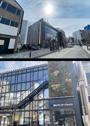 郡山駅前の一方通行の石畳の通り(通称フロンティア通り)の、30年ほど前に整備されたコミュニティ道路です。最近ここに某証券会社の新しいビルが完成しました。非常階段を前面にデザイン的に配置するなど斬新な設計。このビルの名称も「郡山フロンティア通りビル」なのですが、なんと入口の上の壁の前に垂直に植栽??本物なのかフェイクなのか?まさか本物の植物では手入れができないでしょうからフェイクなのでしょう。