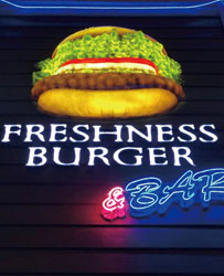このお店ではFRPの立体バーガーサイン、LED内照チャンネルサイン、ネオンチューブサインと3つの仕様が採用されているハイブリットサインとなっています。闇夜に映え、お客を引き付ける実によく考えられたデザインだと感じました。