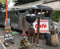 どこかで見たようなあのキャラクターが立っている場所は、東京は奥多摩地域の峠道で営業しているカフェの店先です。森や渓流などの自然に恵まれたこの地域には、キャンプやバーベキューを楽しむ人が大勢やってきます。その行楽地を象徴するかのような丸形のバーベキューグリルが胸のパーツに使われていて、形状がまさにピッタリという感じです。右手のひらにはマグカップに生けられた花を乗せて、道行くお客さんを静かに出迎えていました。街のというよりも森のマスコット、いや天空のマスコット?と言ってしまっていいものか迷います。