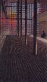ガラスブロックから透けて消えるネオンサイン、柱を中心に広がる幾つもの砂紋―。東京・銀座の一角に、こんな不思議な光景を楽しめる空間がある。入場無料。縁台に腰掛け、好きなだけ眺めていることもできる=写真。