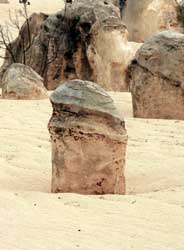 砂漠の中に奇妙な形をした岩がにょきにょき突き出たオーストラリアのピナクルズでは想像力を刺激されます。枯山水風、ゴシック寺院風、逆さ大根風とさまざま。千住博が大徳寺の障壁画を描くに際してこの地で構想を得たということです。 写真の岩は男性諸氏が朝に夕にながめるものとよく似ていませんか。低次元の人(私のことですが)はこんなものを見つけて喜んでいますからどうしようもないですね。でも、これぞ神の造形の賜物!