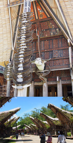妻側の軒下正面に水牛の頭部が据えられ、その上にはデフォルメした鶏の頭部、軒柱には水牛の角がいくつも飾られている。その上板張りの外壁が装飾文様で埋め尽くされている。この様式の家をトンコナンと呼ぶが、これだけの家を建てられる財力の豊かさがしのばれる。